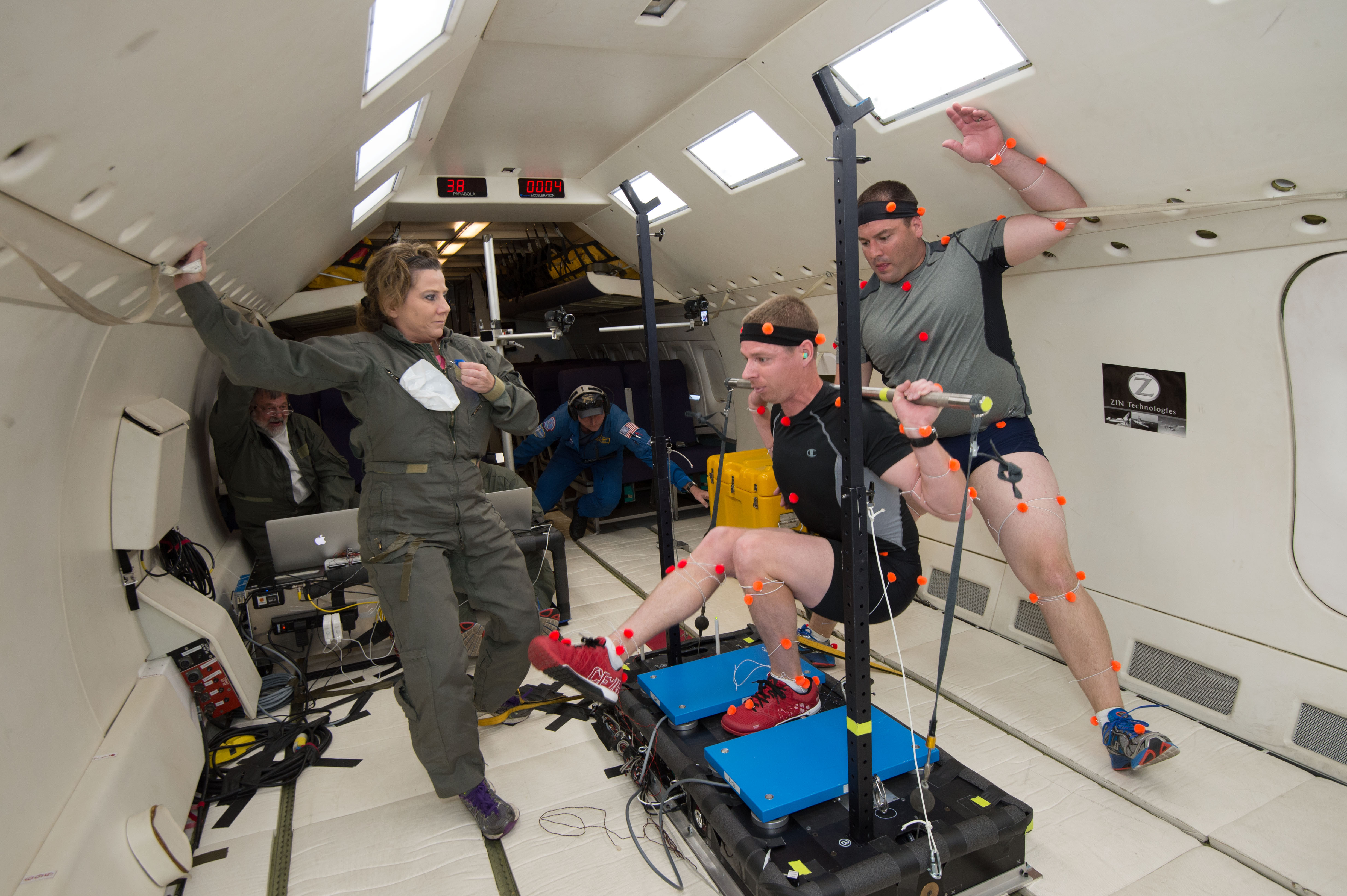 Data collection for the single-leg squat exercise performed during parabolic flight (June 2015). Pictured in foreground, from left to right: Beth Lewandowski, Douwe Bruinsma, and Justin Funk. Pictured in background, from left to right: Greg Funk and Dominic DelRosso.